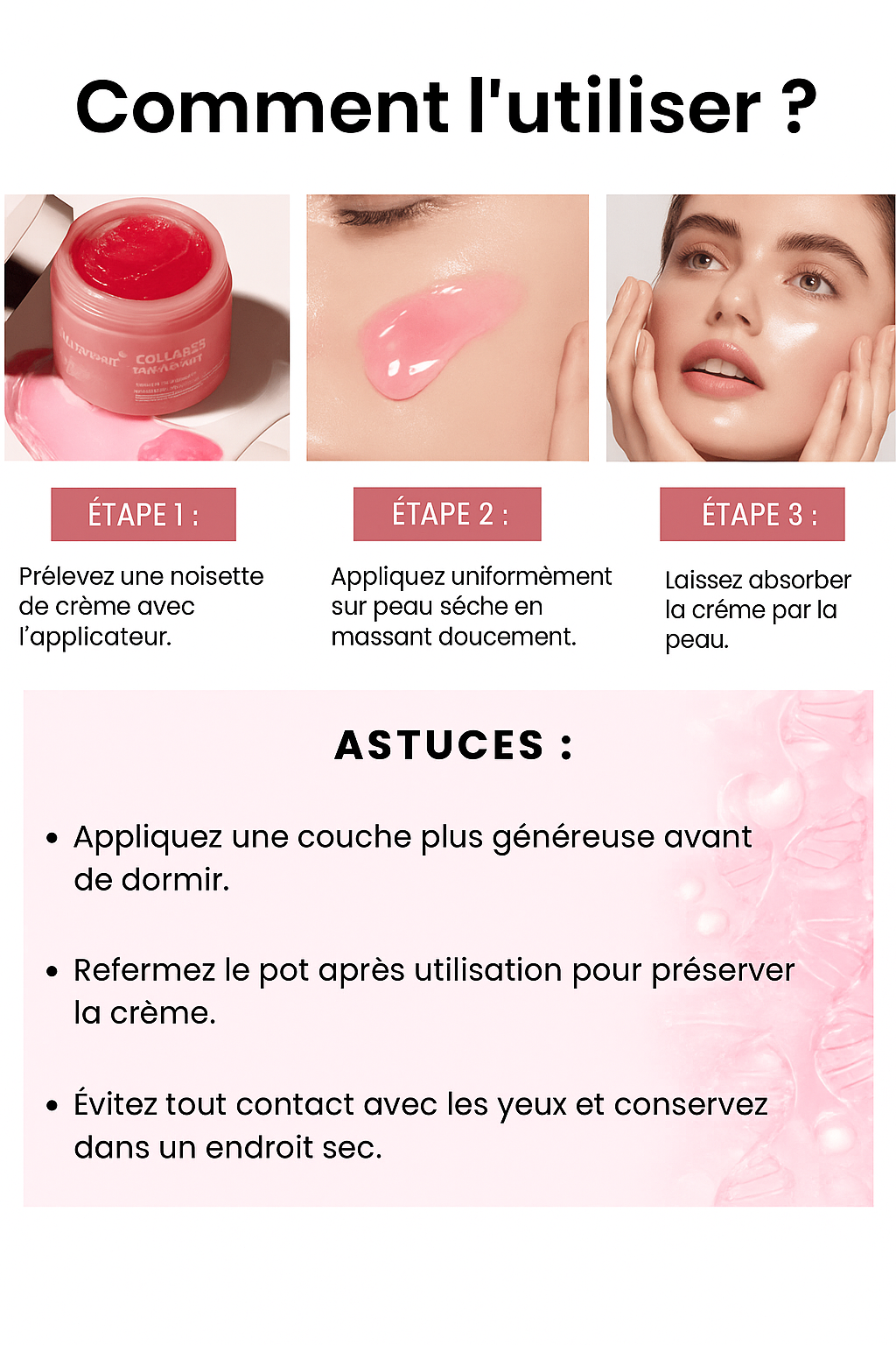 Dites adieu à la peau sèche, terne et fatiguée ! Grâce à notre Crème à la Gelée de Collagène, offrez à votre peau une cure d’hydratation intense, un éclat instantané et une texture douce comme jamais pour révéler une peau effet Glass Skin.